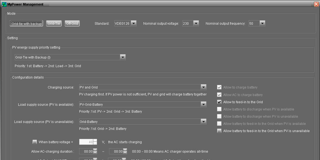 The update will fix the issuelocated in the “My PowerManagment” settings that did not allow you to set load the supply source with PV prioritization (PV-Battery-Grid or PV-Grid-Battery modes).